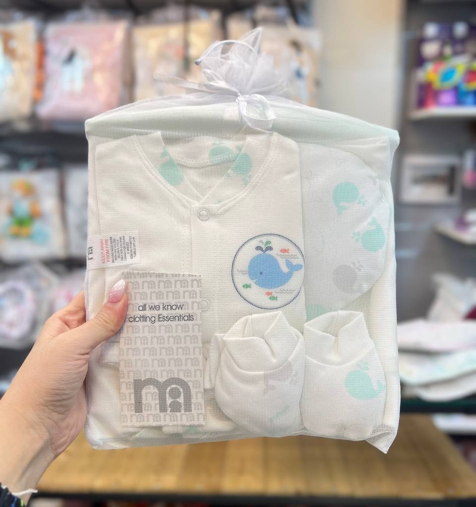 ست 7تکه شامل کلاه.دستکش. دورپیچ.پیش بند.سرهمی دکمه دار .پاپوش.اویز
