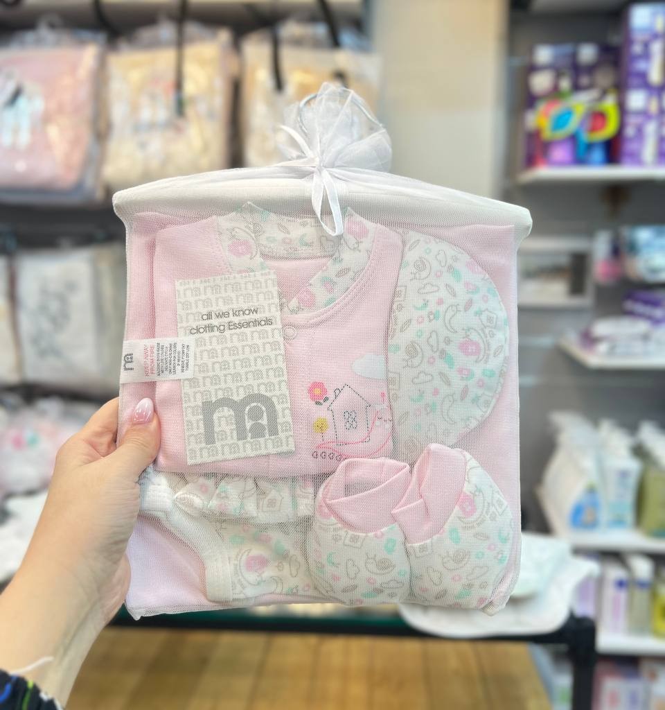 ست 7تکه شامل کلاه.دستکش. دورپیچ.پیش بند.سرهمی دکمه دار .پاپوش.اویز